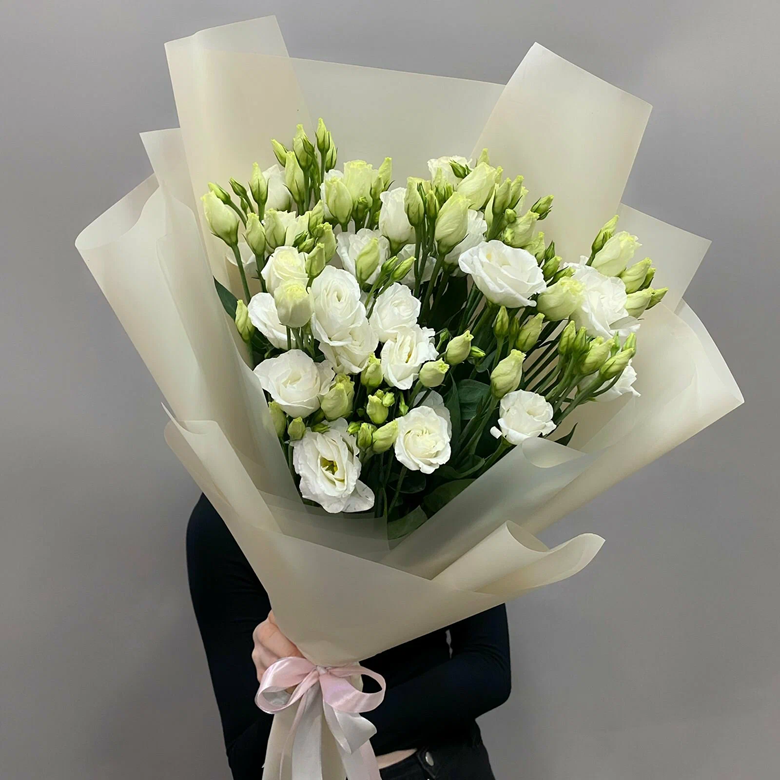 Эустома может иметь оттенки от белого и кремового до насыщенно-фиолетового, розового и даже зеленого. Благодаря этому она гармонично сочетается с различными видами цветов — от классических роз до экзотических альстромерий и декоративных трав. Часто флористы создают моно-букеты из одного оттенка эустомы, подчеркивая её нежность с помощью зелени и минималистичной упаковки. Такие композиции выглядят изысканно и современно.