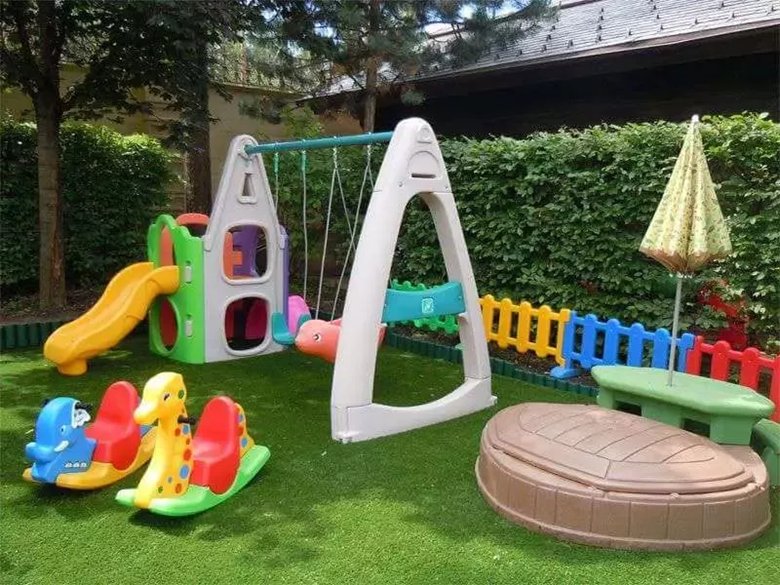 - Найменшим у віці до 3-4 років потрібні ігрові будиночки, пісочниці, невеликі гірки, гойдалки, каруселі. Також необхідні невеликі лавки та пристрої для гри в м’яч.