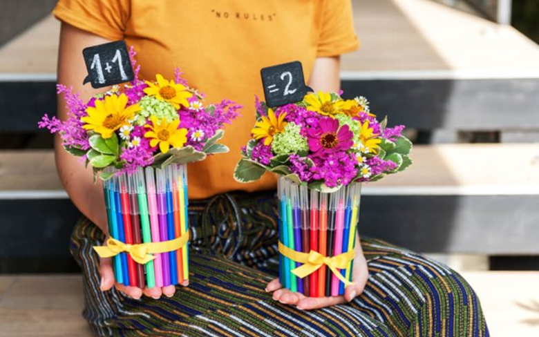 - Соберите в букет яркие ручки, карандаши, маркеры, ластики, линейки, скрепки. Можно добавить небольшие блокноты или стикеры. Это оригинально и действительно практично.