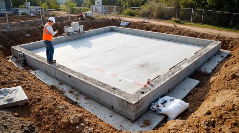 Сборка коробки выполняется уже на готовый фундамент (после заливки через 28 дней). Панелевозом доставляют модули ЖБИ на стройплощадку и, используя автокран, ставят их по 1 на бетонную подготовку по периметру, скрепляя между собой сваркой продетой в тросовые петли на боках арматуры. Затем устанавливают перегородки, настилают перекрытия и герметизируют швы (бетонированием, вспененным п/эт, герметиком), после чего переходят к сооружению кровли, монтажу дверей и окон, прокладке коммуникаций, отделке.