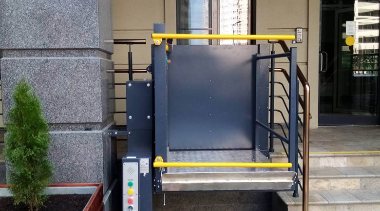 - Платформы с вертикальным способом перемещения. Они могут иметь грузоподъемность в 250 кг, чего хватит для транспортировки двух человек и инвалидного кресла. Высота подъема достигает четырех метров. Предназначены для передвижения между этажами по типу лифтов.
