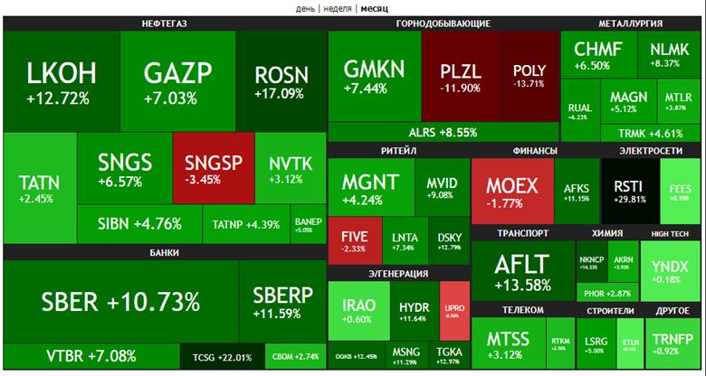 Каждой компании, ценной бумаге присваивается свой квадрат, в нем пишется биржевой тикер и указывается процент изменения цены.